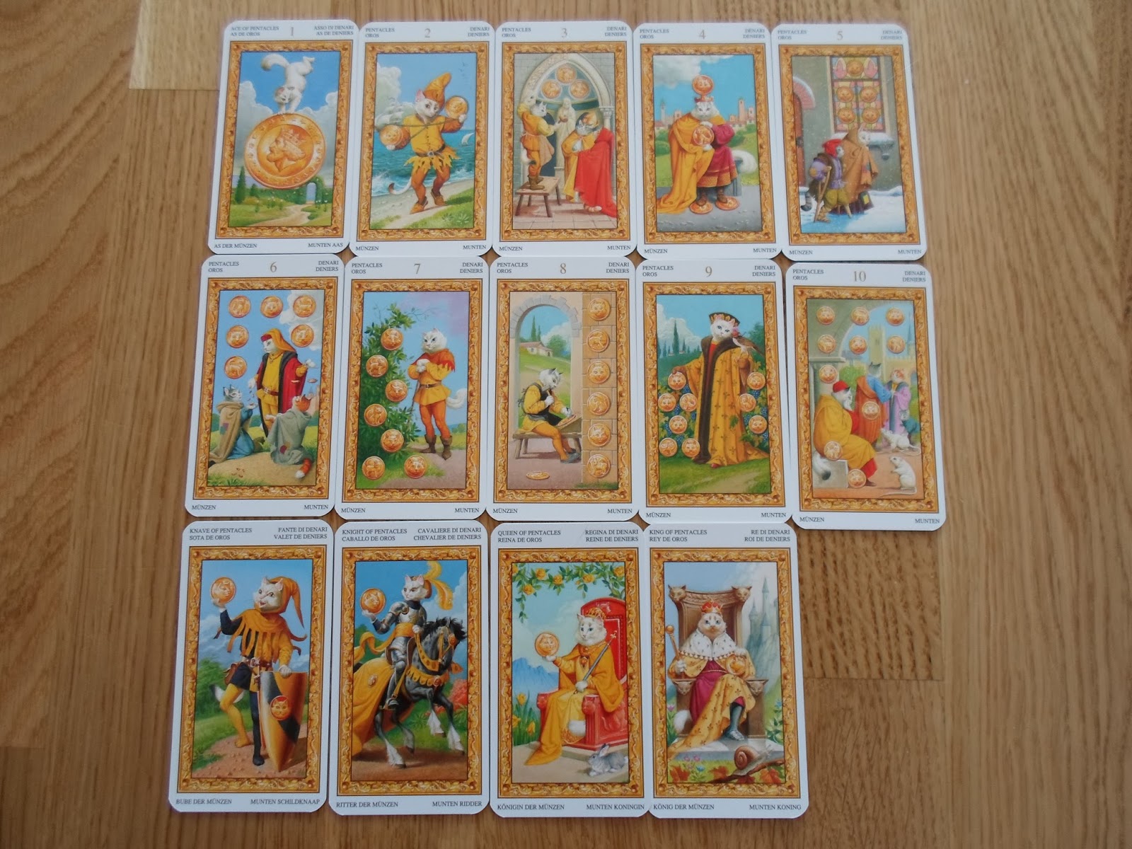 Ett litet minus med leken är att baksidan avslöjar om kortet ligger uppochner eller inte. Lite trist tycker jag också att det är att det är manliga pager i två av sviterna. Dock det är i svärd- och stavsviten vilka ju faktiskt styrs av manlig kraft. Jag gillar som bekant när det är mer jämställt i alla sviterna med en prinsessa och en prins. Annars tycker jag som sagt väldigt mycket om den här leken. Det följde även med en hel bok (på ca 300 sidor) till den om hur den kan tolkas. Det är Ellen Dugans bok med samma namn som leken. I den finns även ett register för vad de återkommande symbolerna, som t.ex. rosor, betyder.